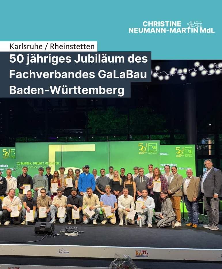 Mit großer Freude durfte ich am Donnerstagabend bei der Doppelfeier anlässlich 50Jahre GalaBau Baden-Württemberg und der Freisprechung der frisch gebackenen Landschaftsgärtnerinnen und Landschaftsgärtner in der Messe Karlsruhe anwesend sein und mit ihnen feiern! Nach intensiven Ausbildungsjahren voller harter Arbeit, Teamgeist und Kreativität haben die Absolventen es geschafft: Sie sind nun offiziell Gärtnerinnen und Gärtner im Garten- und Landschaftsbau!