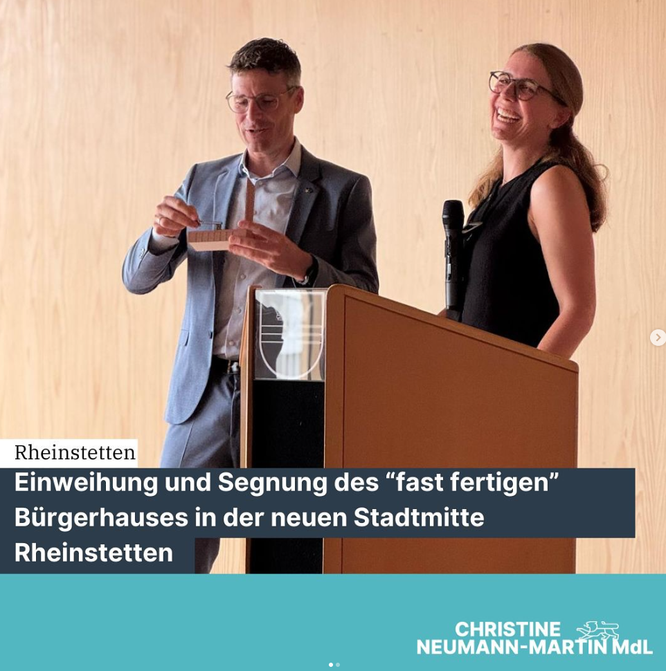 Letzte Woche feierte Oberbürgermeister Schrempp die Eröffnung des „fast fertigen“ Bürgerhauses in der Stadtmitte Rheinstetten. Das Bürgerhaus ist mit viel Holz und vielen großen Fenster ausgestattet und bildet das Herzstück der neuen Stadtmitte. Bei der Ökumenischen Segnung wurde folgender Spruch übergeben: