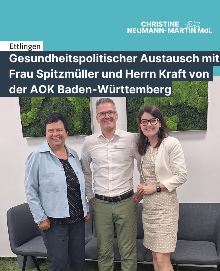 Im erst frisch bezogenem AOK Kundencenter in der Pforzheimer Straße in Ettlingen traf ich mich gestern zu einem gesundheitspolitischen Austausch mit Frau Spitzmüller und Herrn Kraft.