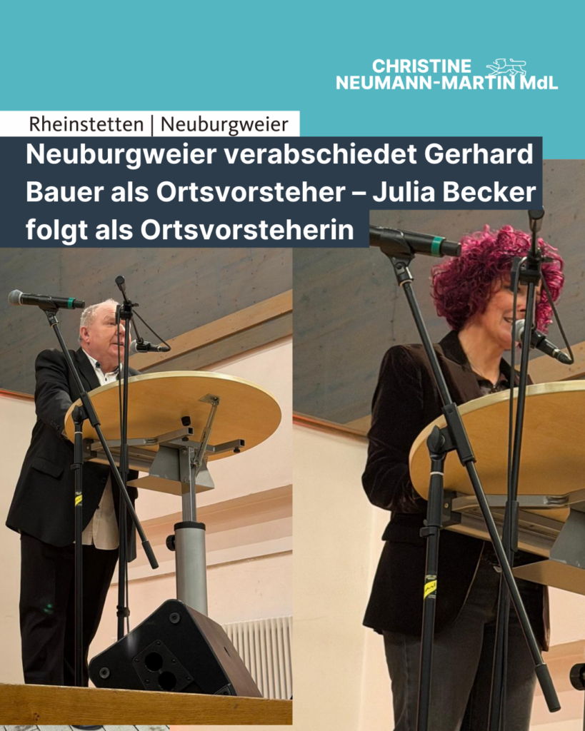Abschied und Neubeginn am Montagabend. Gerhard Bauer wurde nach 21 Jahren als Ortsvorsteher beim Neujahrsempfang in Neuburgweier verabschiedet und Julia Becker in ihr neues Amt als Ortsvorsteherin eingeführt. Sie erhielt ihre Ernennungsurkunde und skizzierte in ihrer Antrittsrede ihre Agenda für ihren Ort. Danke für die geleistete Arbeit und den jahrzehntelangen Einsatz von Gerhard Bauer. Für die kommenden Aufgaben wünsche ich der ersten Ortsvorsteherin von Neuburgweier Julia Becker ein glückliches Händchen.