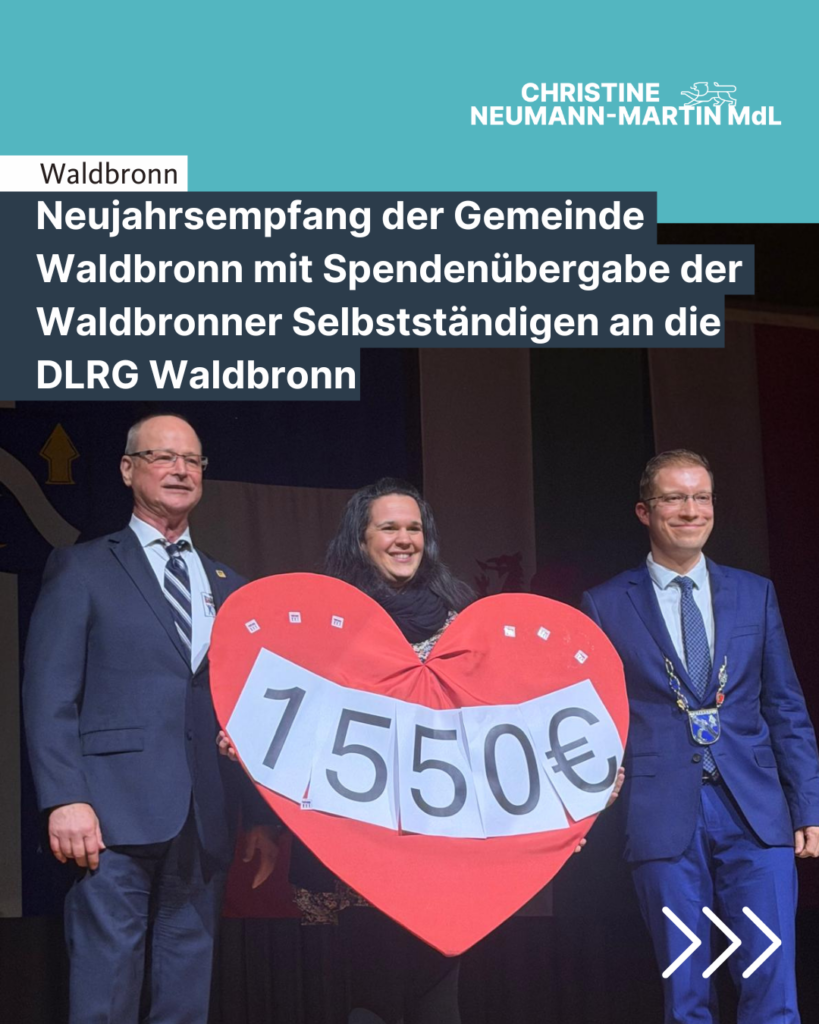 Neujahrsempfang der Gemeinde Waldbronn. Die DLRG Waldbronn erhielt eine Spende in Höhe von 1550€ von den Waldbronner Selbstständigen.